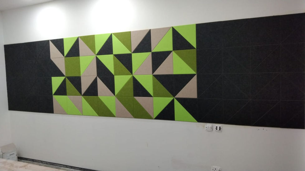 A series of images showcasing modern office spaces with unique designs, including geometric wall panels, wooden ceiling designs, and sleek cabinets.